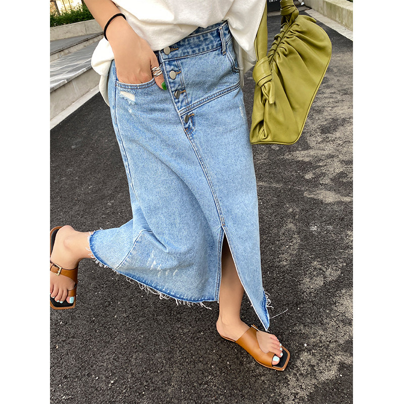 不对称斜门襟牛仔半身裙设计感复古毛边中长款高腰开叉a字裙女夏热门设计联盟服务商