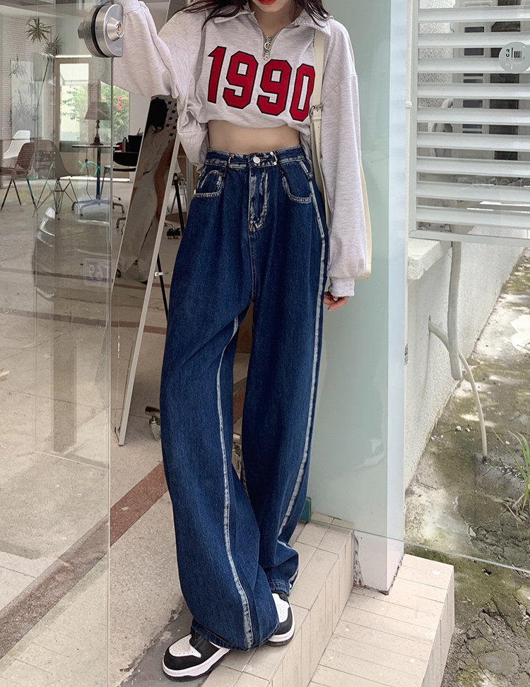 8862#实价实拍 高腰直筒裤拖地长裤可调节腰扣设计感白边牛仔裤热门设计联盟服务商