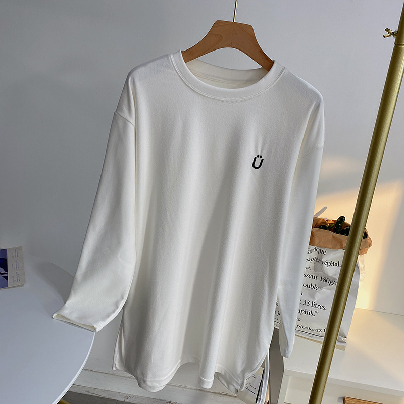 慵懒开叉白色长袖T恤女宽松韩版秋冬加厚磨毛打底衫柔软刺绣图标热门设计联盟服务商